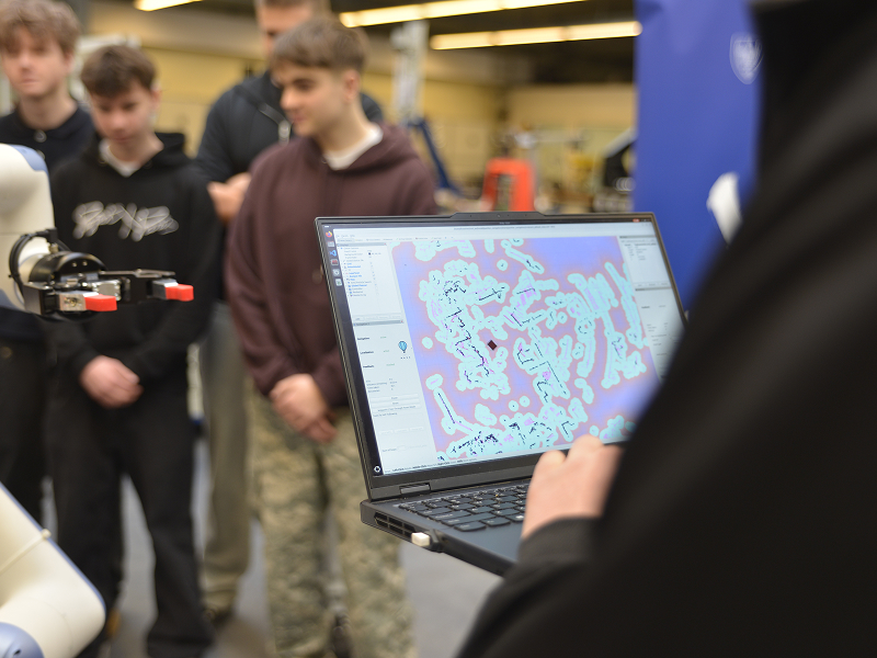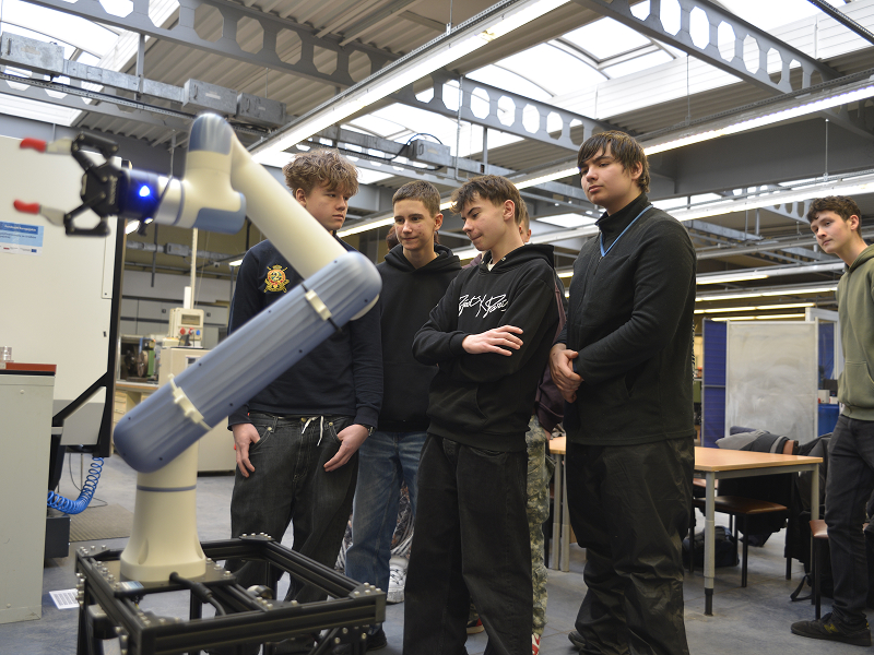 Do laboratorium maszyn inteligentnych trafiamy w kluczowej chwili. Prowadzący – mgr inż. Kacper Bereszyński, młody doktorant, wpisuje ostatnie komendy do komputera. Robot jest już zaprogramowany i gotowy do działania. Zaczyna wykonywać polecenia, a każdy jego ruch bacznie analizuje grupa uczniów. Maszyna zbliża się do magazynu, skąd pobiera próbkę materiału. Następnie kieruje się do obrabiarki CNC. Umieszcza element w odpowiednim miejscu. Po kilku minutach odbiera gotowy produkt. To proces, który w zaawansowanych technologicznie firmach, jest dziś codziennością.
